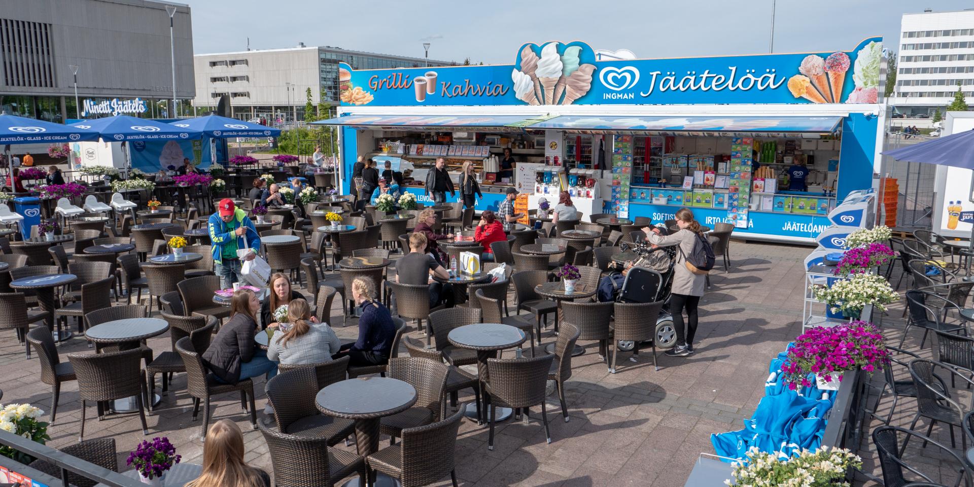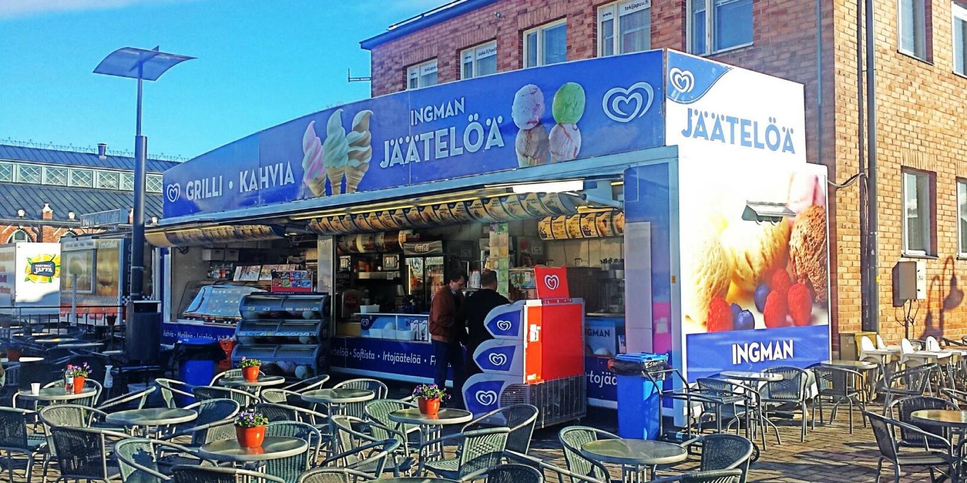 Erilaisia jäätelöannoksia lapsille sekä aikuisille. Laaja avlikoima kylmiä ja lämpimiä juomia. Makkeita herkkuja pikku munkeista jättikorvapuusteihin. Grillistä löydät tuttuja herkkuja kuten makkaraperunoita ja porilaisia, sekä muita uusia herkkuja!